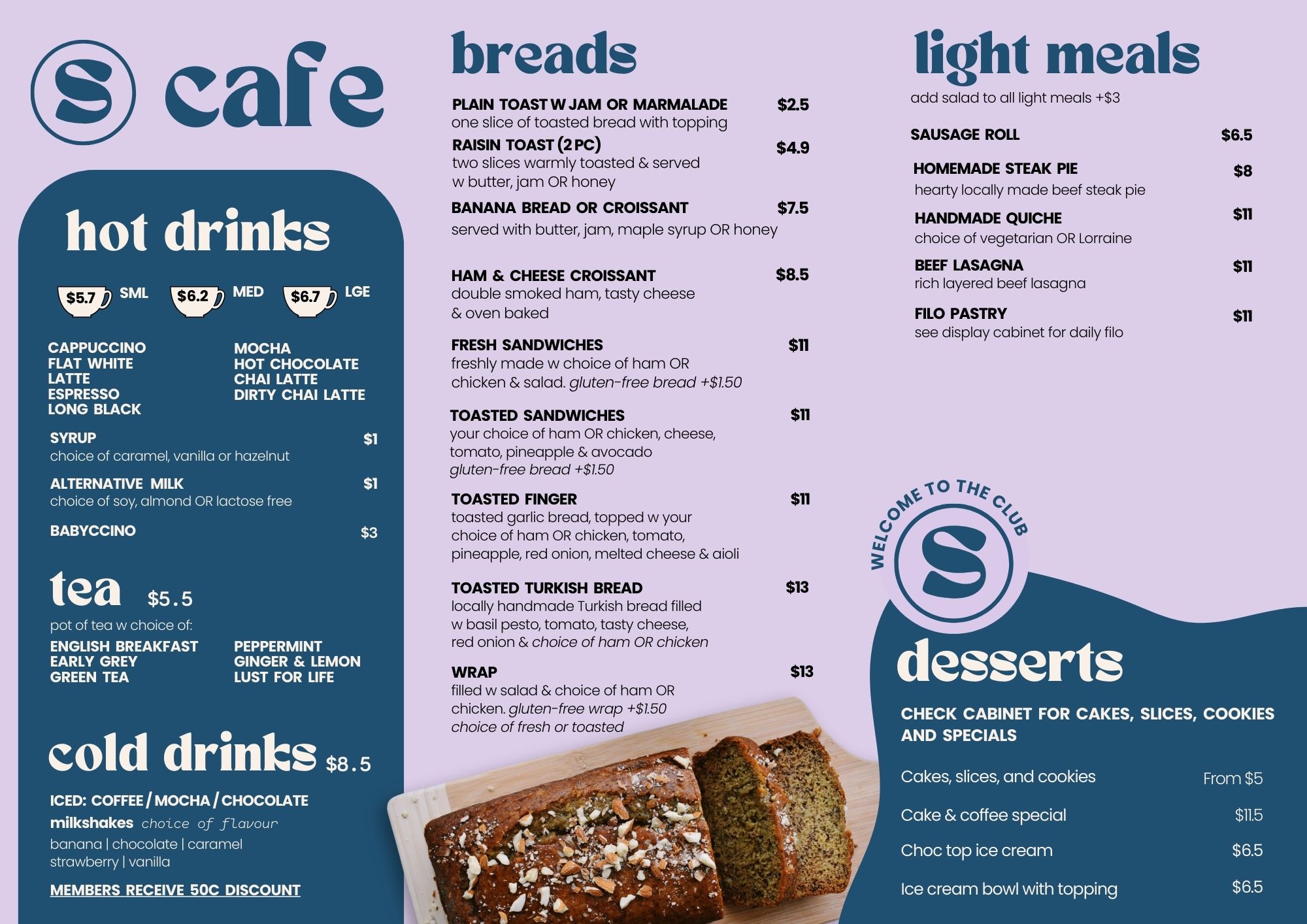 The Cafe is fully licensed for that relaxing drink. There is also a cafe-style menu for you to enjoy a light meal or snack throughout the day and into the night.